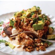 Roasted sweet potatoes with ground chicken, avocado, sauce, and herbs.