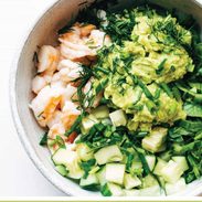 - Assemble: Toss shrimp, avocado mix, cucumber, and herbs together. Season to taste. Eat on the deck in the summer with a cold coconut water and feel like a million bucks!